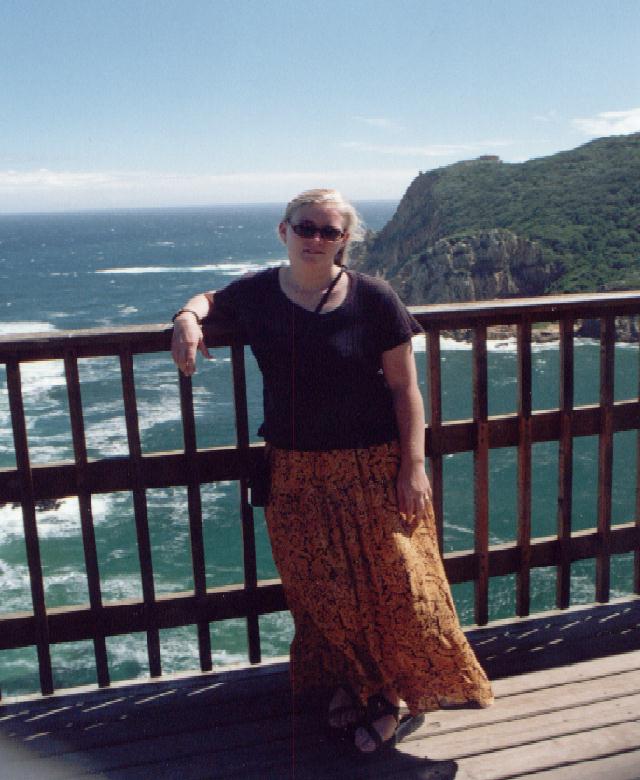 DeeDee on a deck over looking the sea (and shading the tops of her feet!)