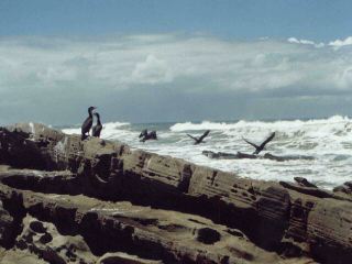 White-breasted Cormorants enjoying the beach at Palm Springs resort (South Africa).